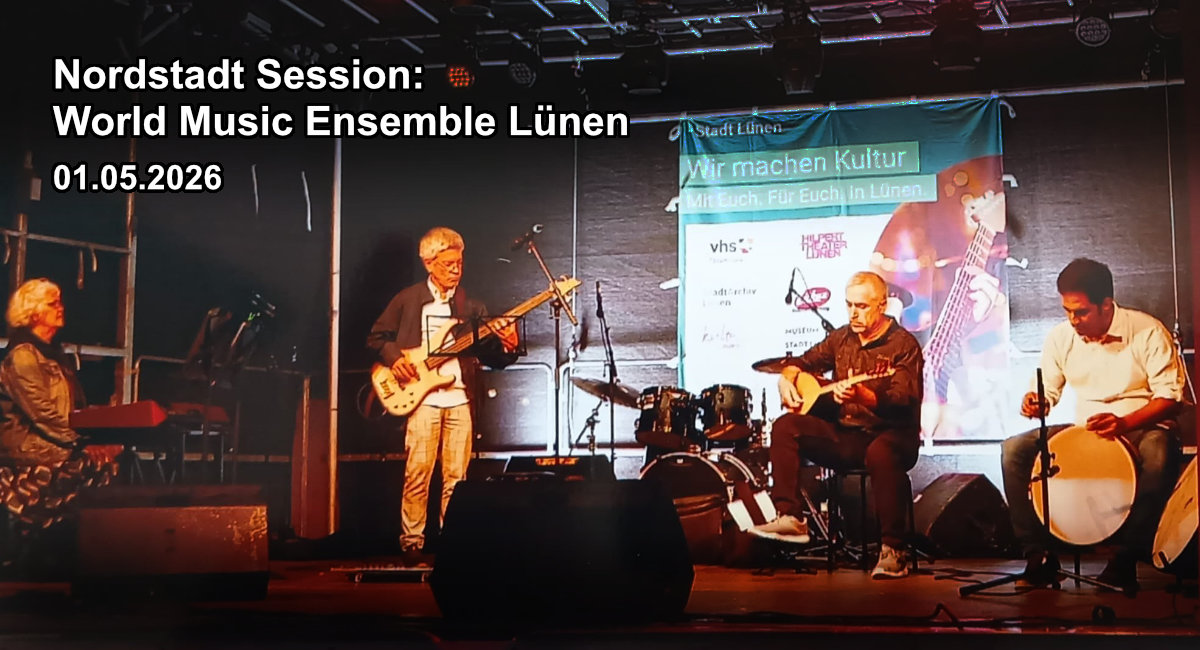 Am 1. Mai 2026 spielt das World Music Ensemble Lünen bei der Nordstadt Session! Mit dabei sind Majed Mohammad (Bouzouki, Baglama), Mohammedreza Mirahmadiaraghi (persische Perkussion), Monika Kutschera (Piano, Maja-Flöte) und Jens Pollheide (Bass, verschiedene Flöten).